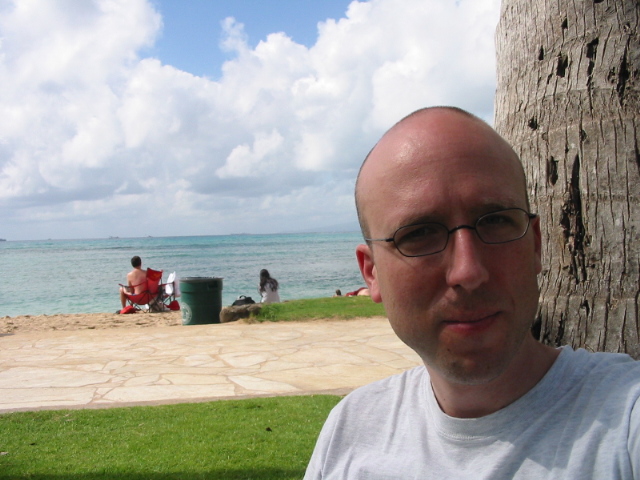And here's me leaning against a palm tree at the beach... (still 600 pages to go in the Count of Monte Cristo)