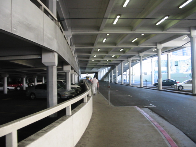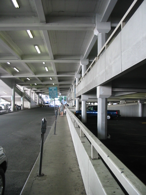 I needed to change buses, so I got off the crowded bus and walked across a big parking ramp.