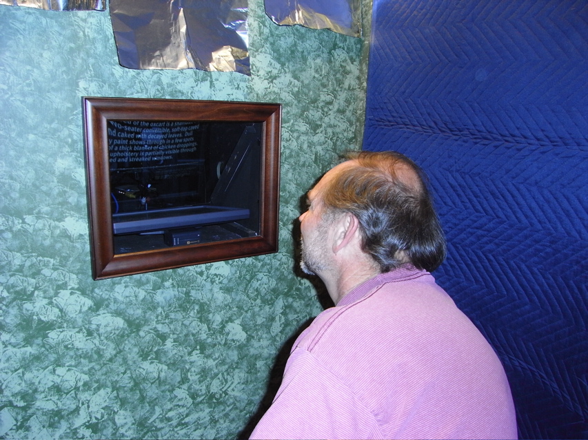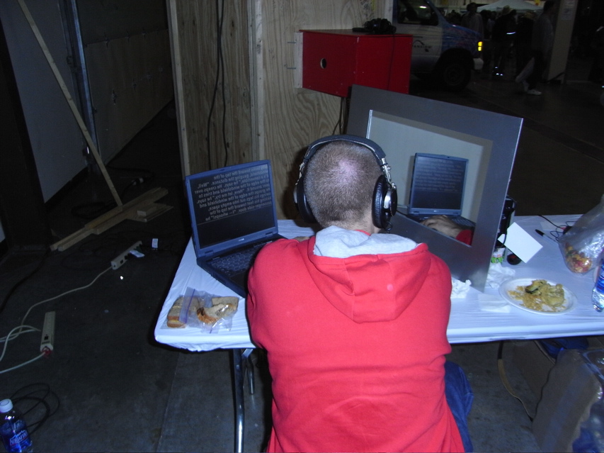 On Sunday we introduced an exciting innovation — headphones so that we could tell what was happening inside the booth. It was a mixed blessing. With the headphones I could operate the prompter myself and keep track of what was happening. The downside was that I could tell when they were trapped, confused, or acting crazy, whereas on Saturday I was blissfully ignorant.